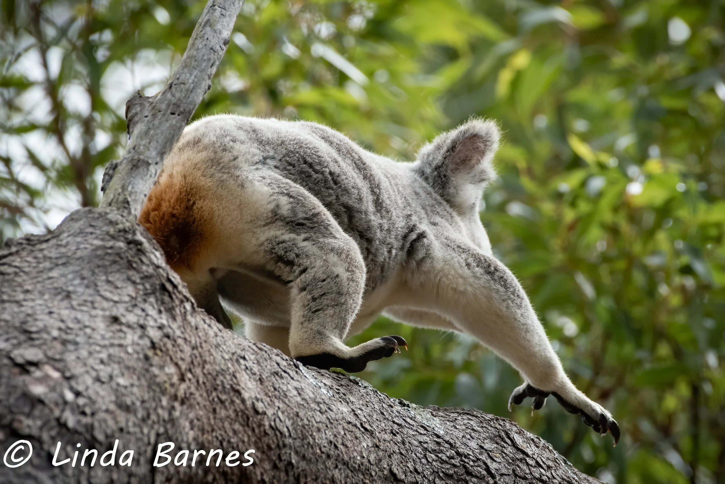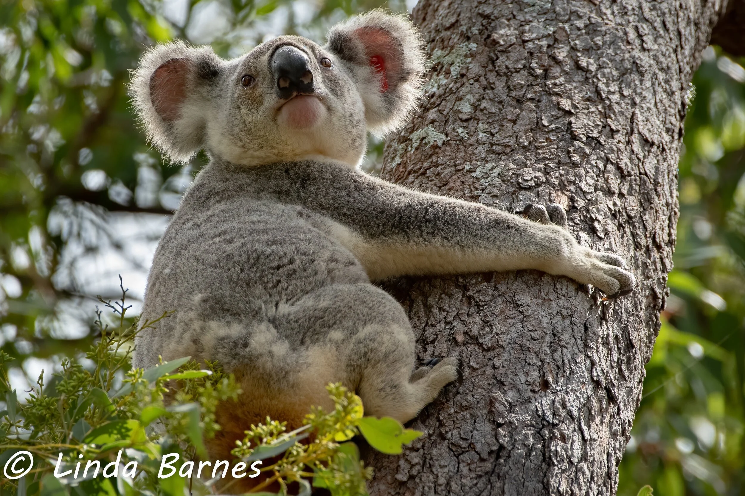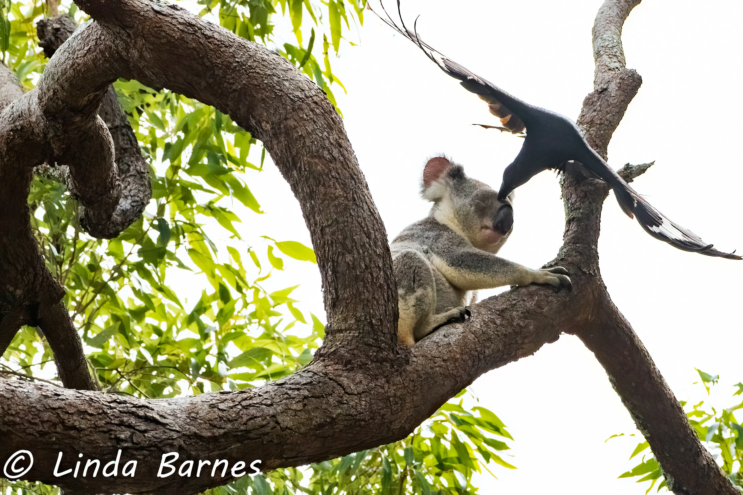Because he’d been in care for so long, little AJ wasn’t as strong in his upper body as he once had been, but we knew that with time, he would gain strength. We watched him climb an ironbark eucalyptus; slowly and gingerly, and make his way along a lateral branch. As he inched further out on the branch, in search of fresh leaf to eat, a large neighbor took notice.